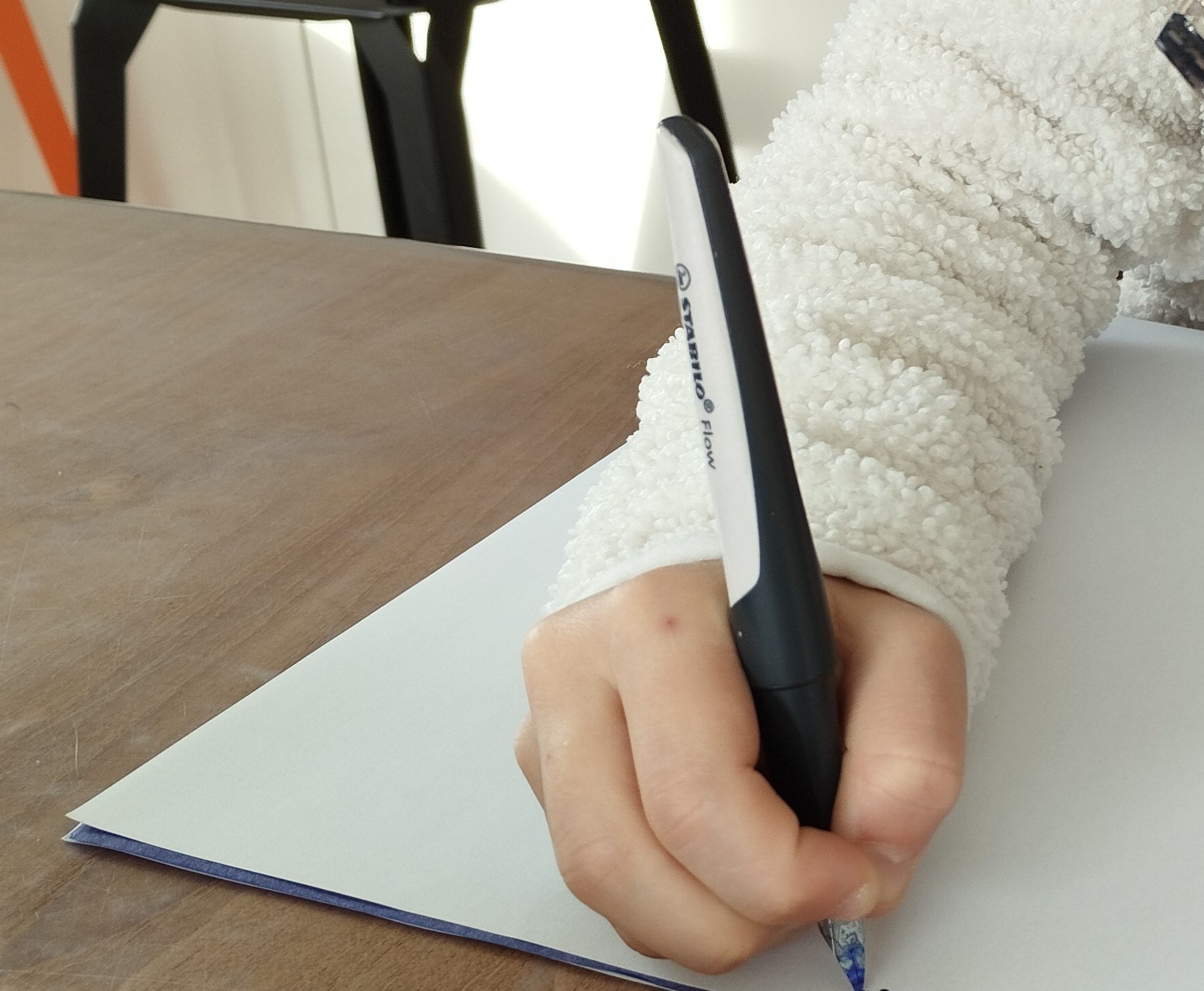 - Après des exercices de dextérité digitale variés, le stylo est maintenant bien tenu entre le pouce et l’index, la main passe sous la ligne d’écriture.